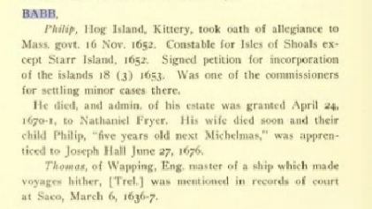 b: 1664, Isles of Shoals, Appledore, Maine; d: Aug 13, 1748, Isles of Shoals, Appledore, Maine; m: Bathsheba Hussey 1683, Hampton, New Hampshire, b: Sept 21,1671, Hampton, Rockingham, New Hampshire; d: Oct 3, 1713, Brandywine Hundred, New Castle, Delaware; m: 2) Elizabeth Conway March 25, 1720, New Castle Co, Delaware, b: Sept 9, 1687, Newark, New Castle, Delaware; d: unknown |