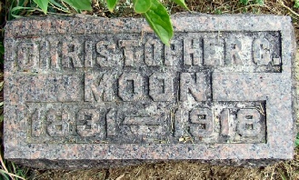 Christopher Columbus Moon b: August 21,1831, Clinton Co., Ohio; d: February 2, 1918, Martinsville, Clinton Co., Ohio; m: Melissa Ann Wright December 2, 1852, Clinton Co., Ohio; b: May 28, 1833; d: May 17, 1889, Martinsville, Clinton Co., Ohio; she was the daughter of Samson and Anna (Hiatt) Wright.