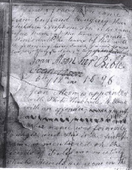 This is a page from the personal Bible of Joan Moon. She and her husband, James Moone, and their children emigrated from Bristol, England in 1689.
