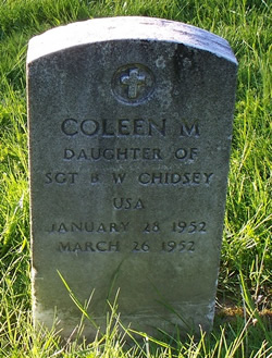 # 879- #879 Coleen Macheal Chidsey b: January 05, 1952 Aberdeen Proving Grounds, Maryland; d: April 03, 1952 Aberdeen Proving Grounds, Maryland #880 Bruce Edward Chidsey m: Margaret Mary O'Neill #881 Kathleen Lila Chidsey m: Patrick Jacobson #882 Cynthia Mavreen Chidsey m: #1) George James McClaskey; m: #2) Paul Howard Farmer #883 Sean Michael Chidsey m: Heidi Denise Nixon #884 Eileen Patricia Chidsey m: Stephen Peter Roehrs