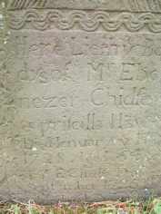 Inscription: Here Lieth ye Bo dys of Mr Ebe nezer Chidsey & priscilla His wife Died Jenuary ye 1st 1728 Aged 54 Mr E Chidse Died September 1726 Aged 61 Years