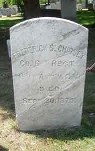 Frederick Chidsey Birth: unknown Death: Sep. 30, 1875 Inscription: Co. G. 1 Reg. HVY ARTY C.V. Burial: Grove Street Cemetery New Haven, New Haven County Connecticut, USA |