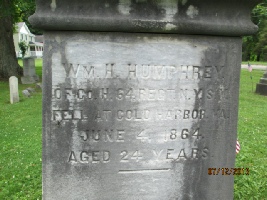 #4707 Adeline Amelia Humphrey b: December 8, 1822, Ithiaca, New York; m: Frederick C Gridley July 8, 1841, Hudson, St. Croix, Wisconsin #4708 Julia Caroline Humphrey b: February 5, 1823, Speedsville, New York; d: 1904, Florida, Orange, New York; m: George Washington Seward August 18, 1852, Speedsville, Tompkins, New York b: August 26, 1808, Speedsville, Tompkins, New York; d: December 7, 1888 Florida, Orange, New York; son of Samuel S and Mary (Jennings) Seward #4709 Jane Amanda Humphrey b: Marvh 24, 1826, Speedsville, New York #4710 Herman Loin Humphrey b: March 14, 1830, Candor, Tioga, New York; d: June 10, 1902, Hudson, St Croix, Wisconsin; m: #1) Jennie Ann Cross about 1867; b: January 20, 1830, Saratoga, Saratoga, New York; d: January 31, 1880, Hudson, St. Corix, Wisconsin; m: #2) Kitty Elvira Door b: April 1, 1842; d: August 2, 1922, Hudson, St. Croix, Wisconsin #4711 Lucius Arnold Humphrey b: July 28, 1832, Candor, Tioga, New York; d: May 10. 1918, Ogden, Weber, Utah; m: Cynthia Ella Burch June 30, 1898, Utah; b: November 1873, Ogden, Weber, Utah; d: February 13, 1958, Glendale, Los Angeles, California; dau of James and Nancy Lorena (Stewart) Burch #4712 William Henry Humphrey b: September 5, 1840, Berkshire, Tioga, New York; d: June 4, 1864, Cold Harbor, Hanover, Virginia