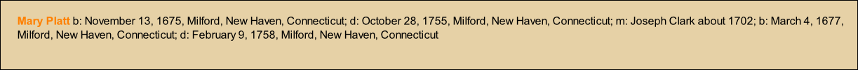b: 24, March, 1703, Milford, New Haven, Connecticut; d: September 9, 1755, Milford, New Haven Connecticut; m: Joseph Sanford about 1728; b:July 5, 1701, Milford, New Haven, Connecticut; d: September 9, 1754 |