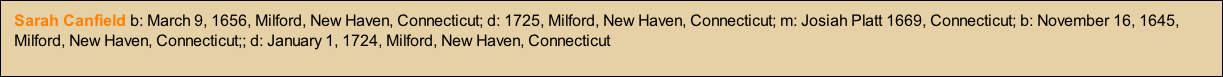 b: November 13, 1675, Milford, New Haven, Connecticut; d: October 28, 1755, Milford, New Haven, Connecticut; m: Joseph Clark about 1702; b: March 4, 1677, Milford, New Haven, Connecticut; d: February 9, 1758, Milford, New Haven, Connecticut